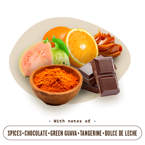 Spices, chocolate, green guava, tangerine, dulce de leche.