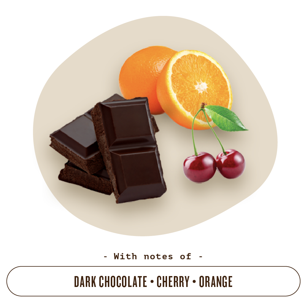 Dark Chocolate, cherry, notes of orange, with a delicate, silky body, and medium acidity