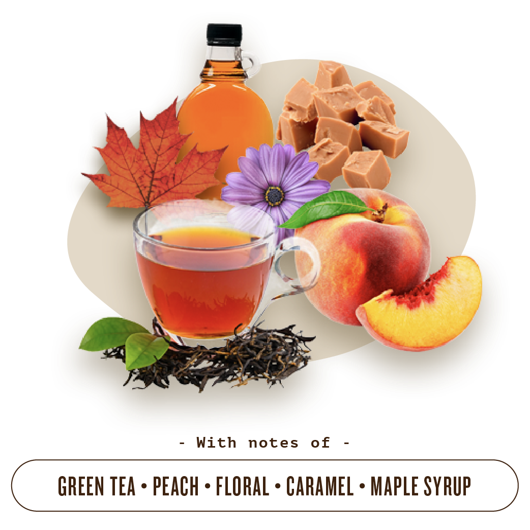 Green tea, peach, floral, caramel, maple syrup, with high citric acidity, juicy body and delicate profile.